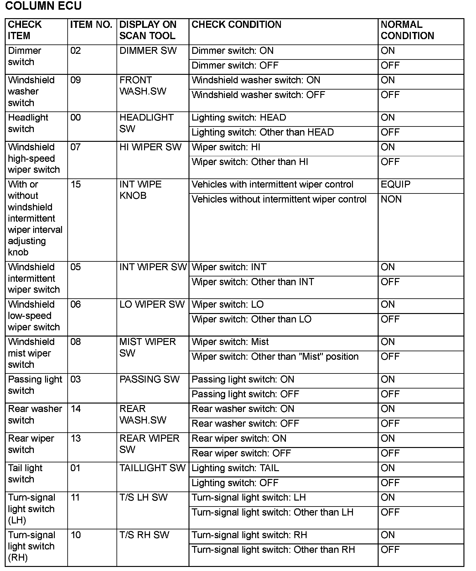 NOTE: For item No.43, the scan tool MB991958 (M.U.T.-III Sub Assembly) also displays "ON" when the light reminder tone alarm or the seat belt tone alarm function is triggered.