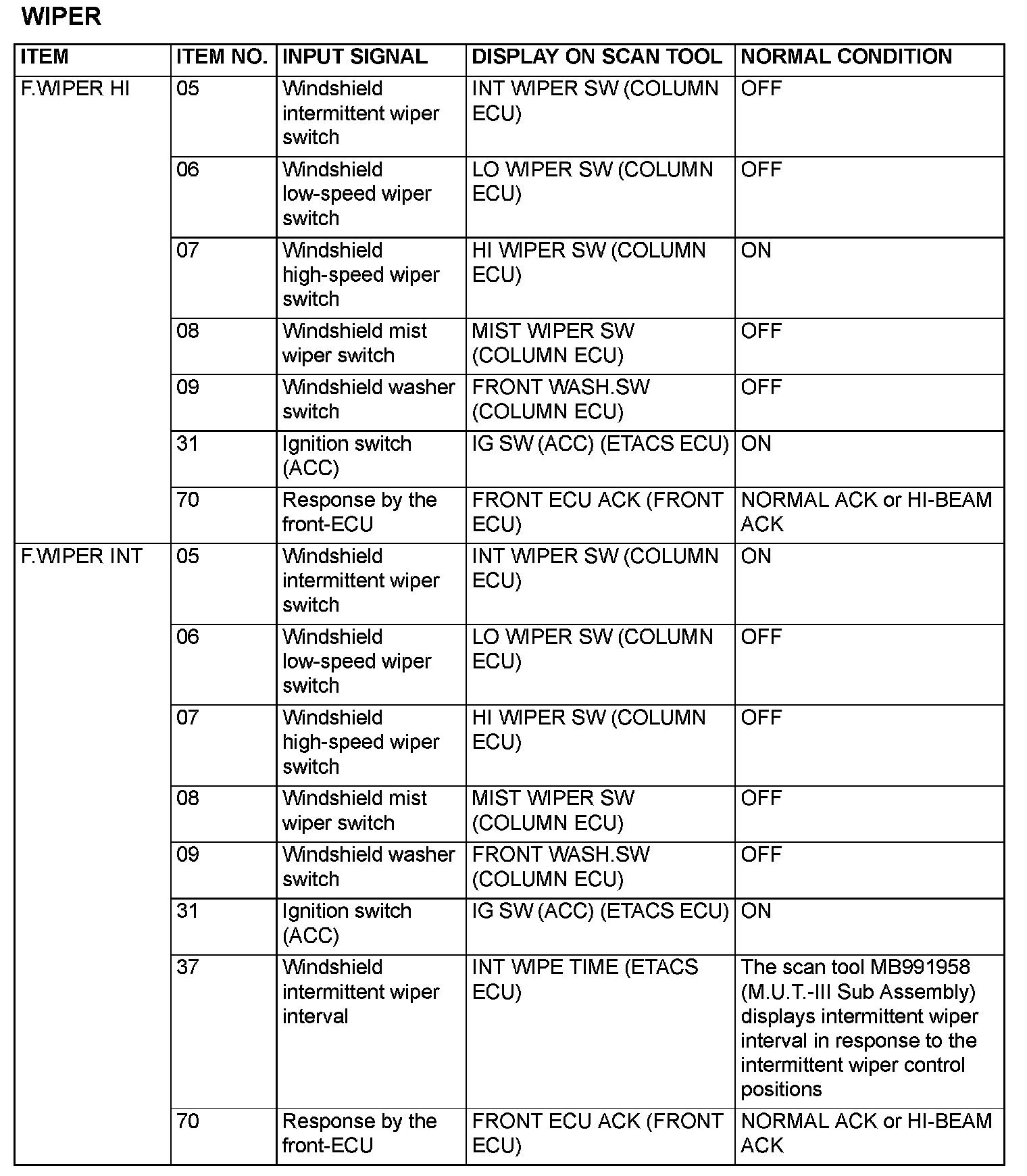 For checking item "HEADLIGHT HI", the scan tool MB991958 (M.U.T.-III Sub Assembly) displays "OFF" on the item No.2 "DIMMER SW" when the headlights are at high-beam. Therefore, the scan tool MB991958 (M.U.T.-III Sub Assembly) should display "ON" momentarily when the dimmer switch is operated.