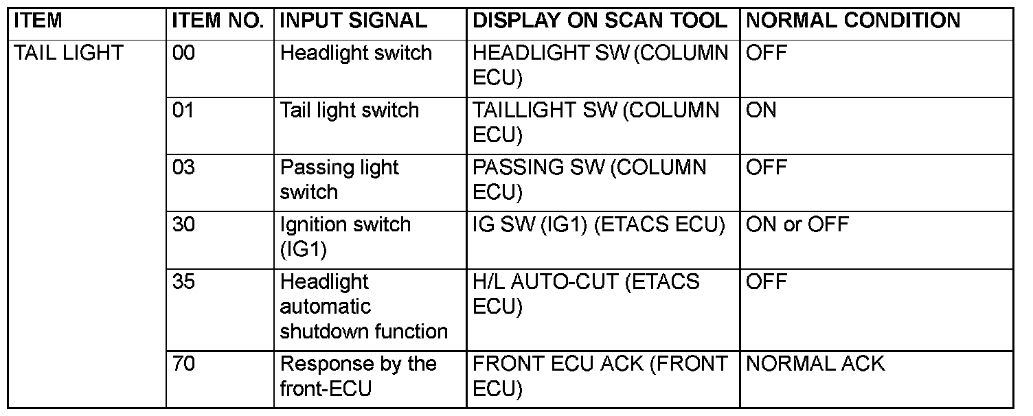 NOTE: When checking the input signals (off, tail, low-beam or high-beam), turn the ignition switch to the "ON" position in order to disable the headlight automatic shutdown function. However, the headlight operation does not depend on the ignition switch positions, the scan tool MB991958 (M.U.T.-III Sub Assembly) does not display the title "IGNITION SWITCH".