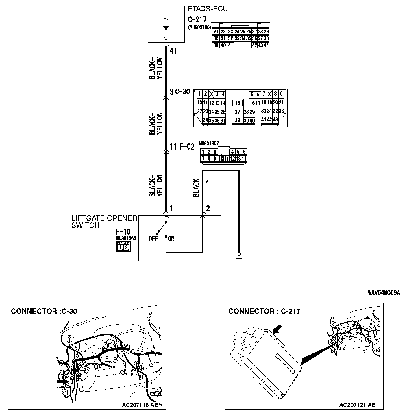 STEP 6. Check the wiring harness between liftgate opener switch connector F-10 (terminal 1) and ETACS-ECU connector C-217 (terminal 41).