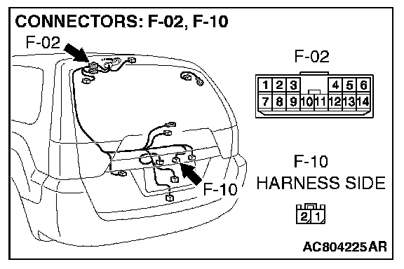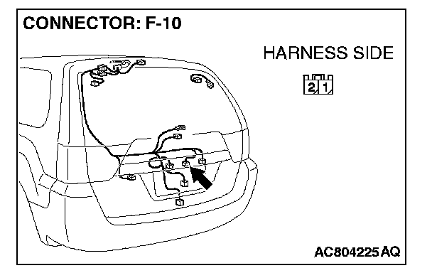 STEP 1. Check liftgate opener switch connector F-10 for loose, corroded or damaged terminals, or terminals pushed back in the connector.