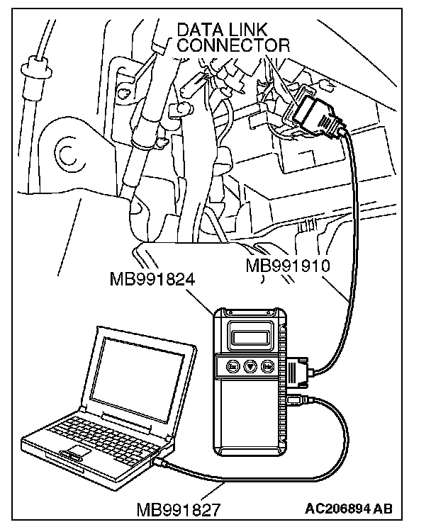 CAUTION: To prevent damage to scan tool MB991958, always turn the ignition switch to the "LOCK" (OFF) position before connecting or disconnecting scan tool MB991958.