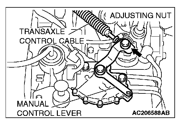 6. Gently push the transaxle control cable in the direction of the arrow, until the cable is taut. Tighten the adjusting nut.