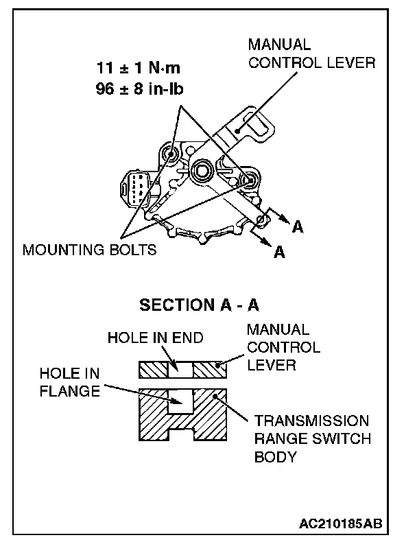 NOTE: The transmission range switch body can be aligned by inserting a 5-mm diameter steel bar into the end hole of the manual control lever and the flange hole of the transmission range switch body.
