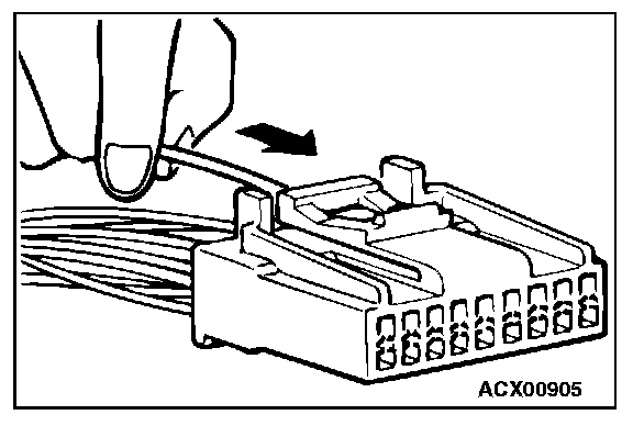 3. Insert the tip of the screwdriver [1.4 mm (0.06 inch) width] into the connector as shown in the figure, gently push the housing lance down with the tip, and pull out the terminal.