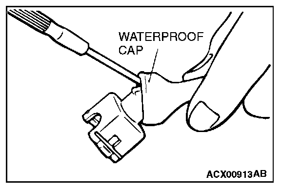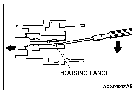 2. Insert the tip of a screwdriver [0.8 mm (0.03 inch) width] into the connector as shown in the figure, push it lightly to raise the housing lance, and pull out the terminal.