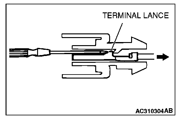 CONNECTOR TERMINAL ENGAGEMENT AND DISENGAGEMENTLoosely engaged terminals can be repaired by removing the female terminal from the connector housing and raising its lance to establish better engagement. Removal of the connector terminal used for MFI and INVECS-II A/T control circuit can be done in the following manner.