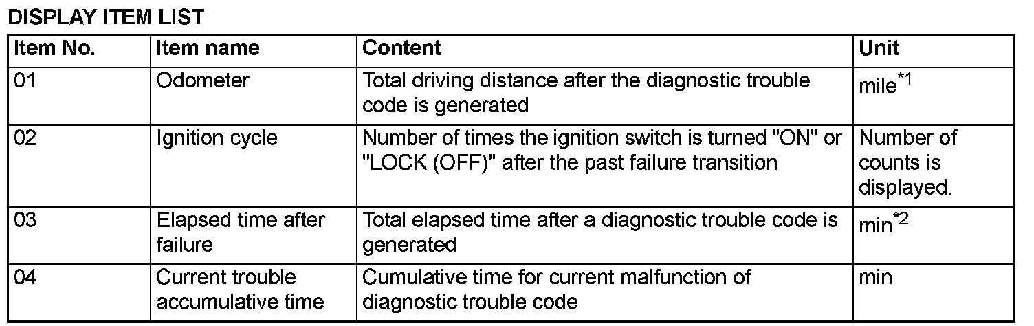 - *2: Total elapsed time can be stored up to 65,534 minutes (45.5 days). The display of scan tool is fixed to 65,534 minutes after 65,534 minutes have elapsed. Or, if the battery is disconnected, the total elapsed time cannot be measured properly. Thus, 65,535 minutes (null value) is displayed. Because it is calculated based on the ETACS-ECU information, the correct display may not be shown if the ETACS-ECU has had a timeout.