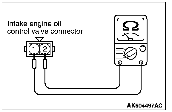 2. Measure resistance between terminal No. 1 and terminal No. 2 of the connector at the intake engine oil control valve side.