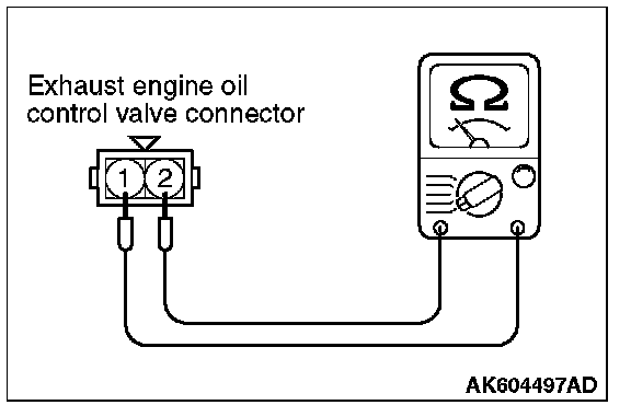 2. Measure resistance between terminal No. 1 and terminal No. 2 of the connector at the exhaust engine oil control valve side.