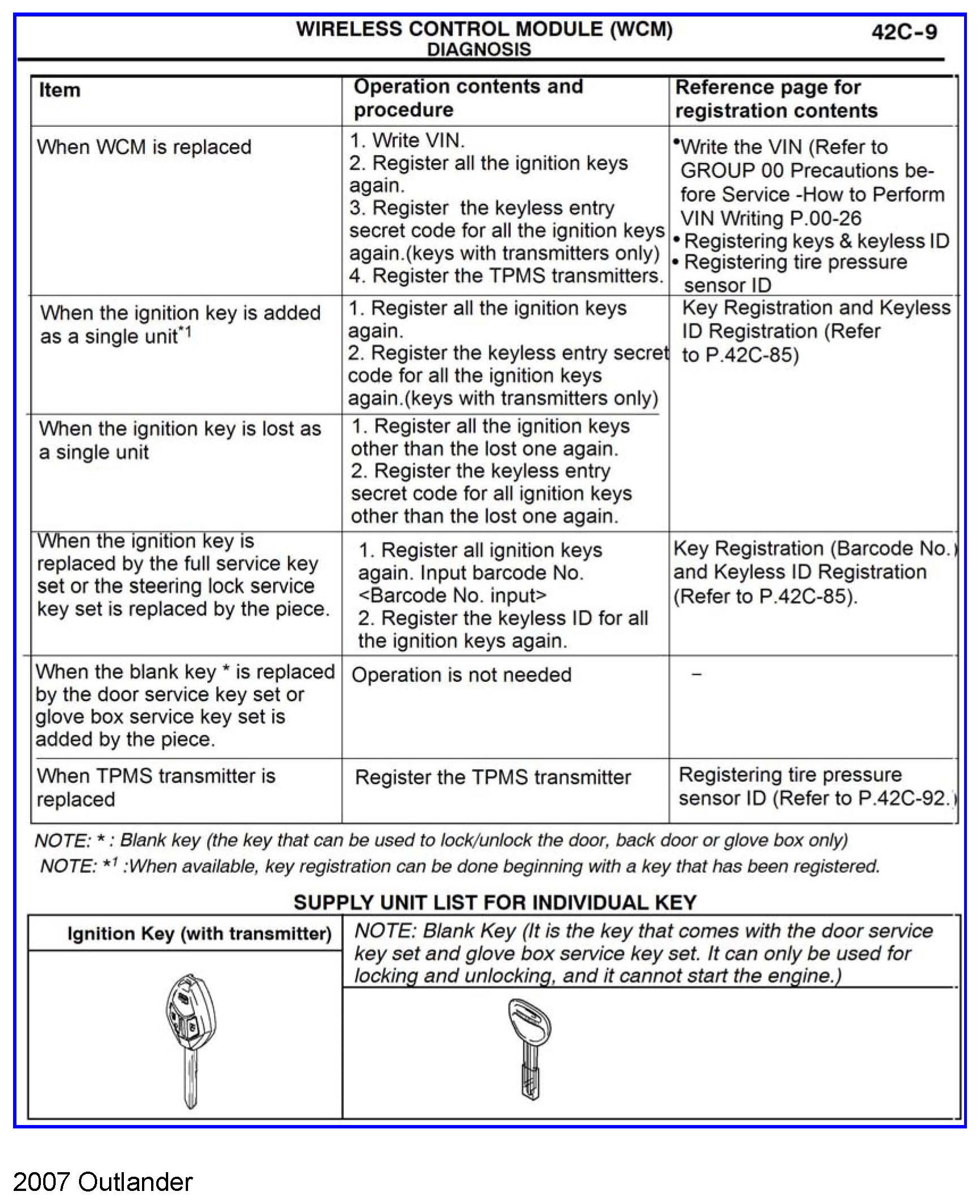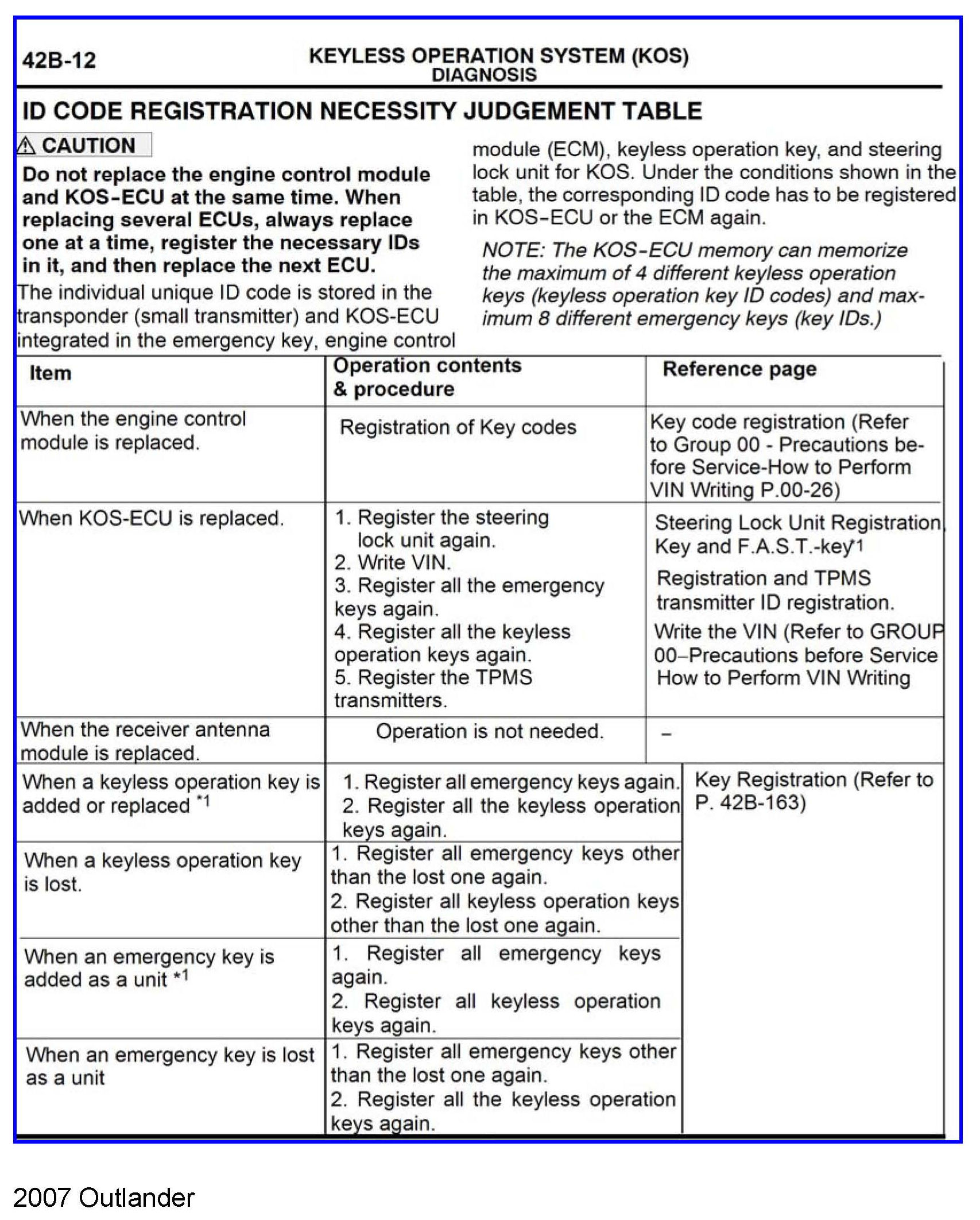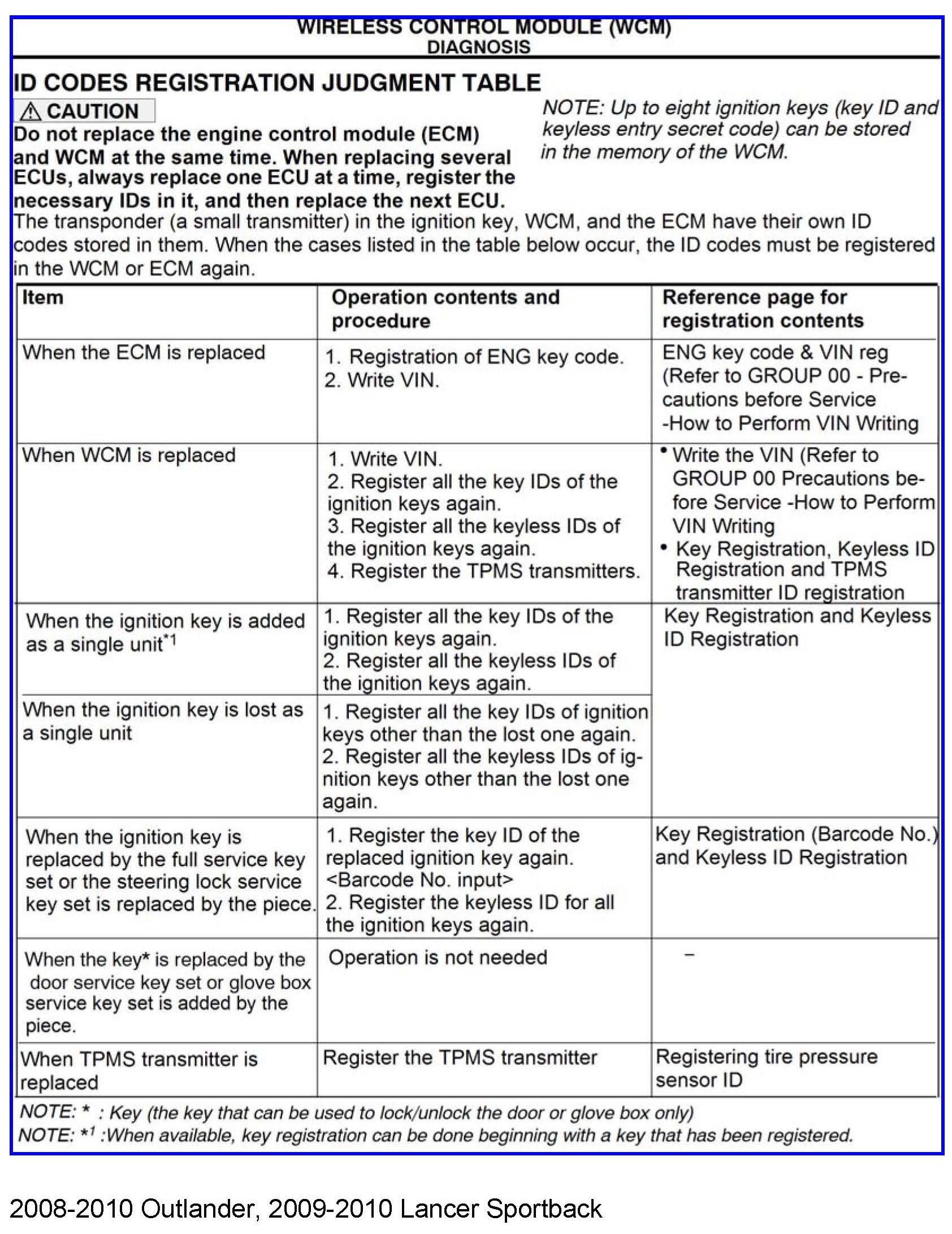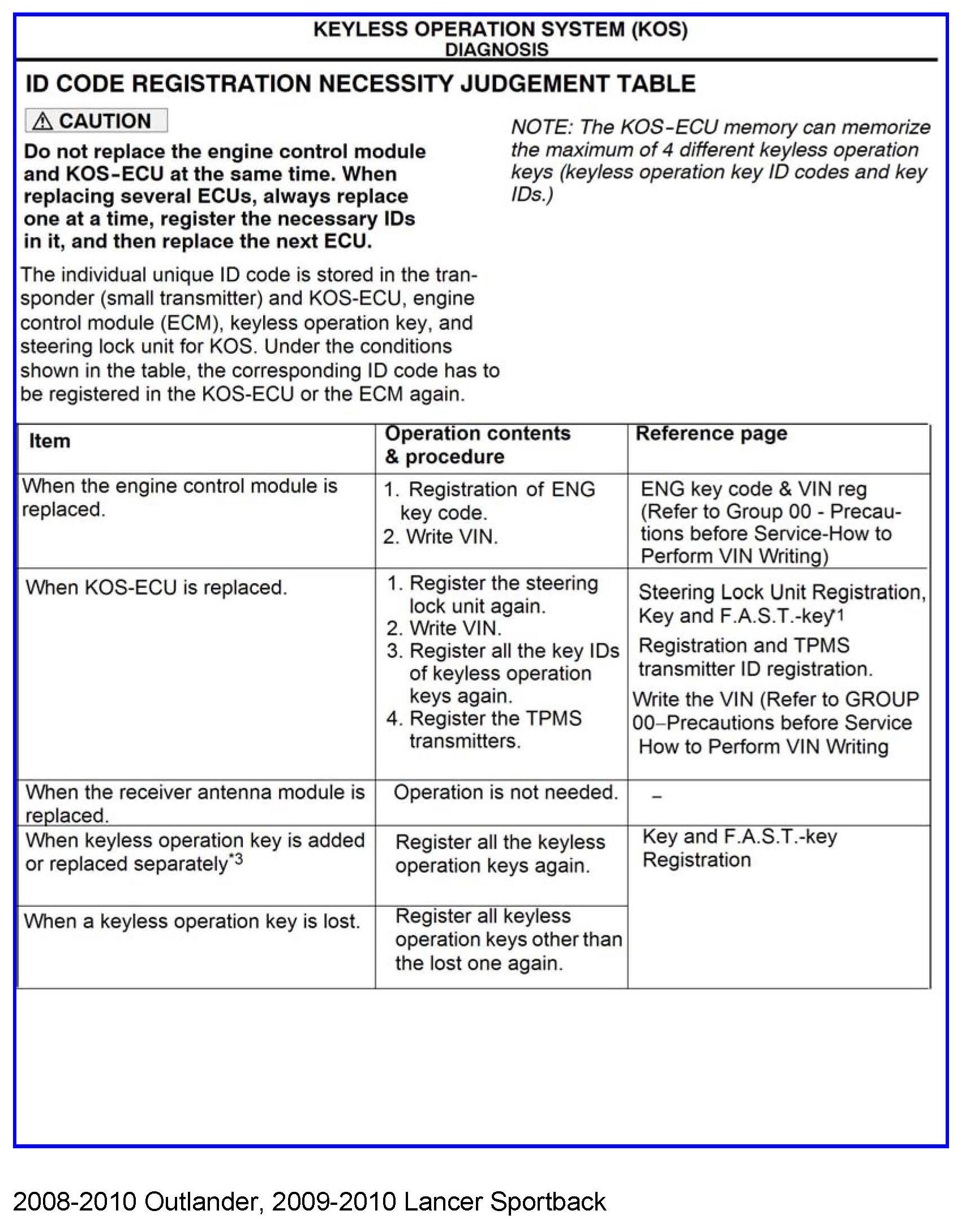 Some ID Code Registration information for the KOS (Keyless Operating System), WCM (Wireless Control Module) and Immobilizer systems is incorrect in the affected service manuals. This bulletin contains corrected information and replaces the affected service manual pages listed below.