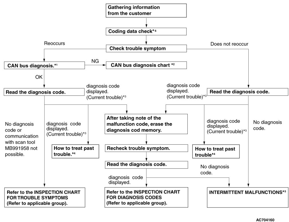 Troubleshooting of electronic control systems for which scan tool MB991958 can be used follows the basic outline described below. Even in systems for which scan tool MB991958 cannot be used, some of these systems still follow this outline.