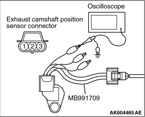 1. Disconnect the exhaust camshaft position sensor connector, and connect the test harness special tool (MB991709) between the separated connector (All terminals should be connected).
