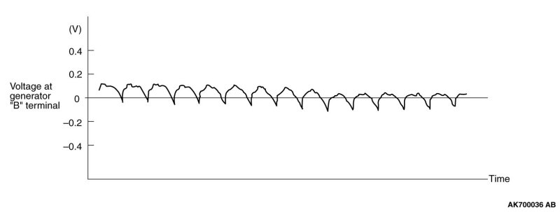 The voltage waveform of the generator "B" terminal can undulate as shown at left. This waveform is produced when the regulator operates according to fluctuations in the generator load (current), and is normal for the generator.