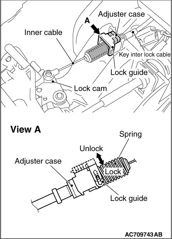 (3) Install the tip of the key interlock cable to the lock cam of the selector lever assembly, taking care not to twist the inner cable.