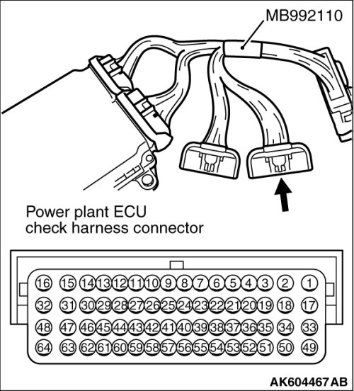 1. Disconnect all ECM connectors. Connect the check harness special tool (MB992110) between the separated connectors.
