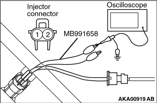 3. Connect the oscilloscope probe to injector connector terminal No. 2.