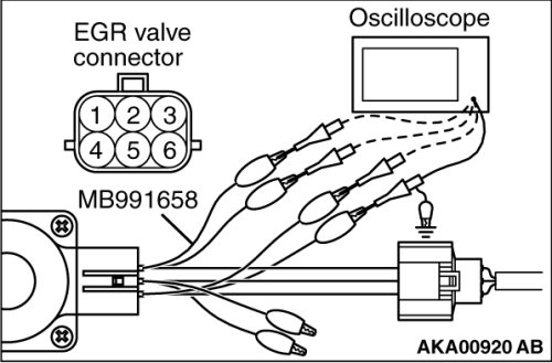 2. Connect the oscilloscope probe to the EGR valve connector terminal No. 1, terminal No. 3, terminal No. 4, terminal No. 6 respectively.