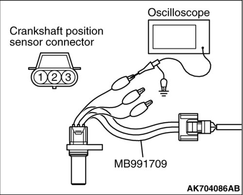 3. Disconnect the crankshaft position sensor connector, and connect the test harness special tool (MB991709) between the separated connector (All terminals should be connected).