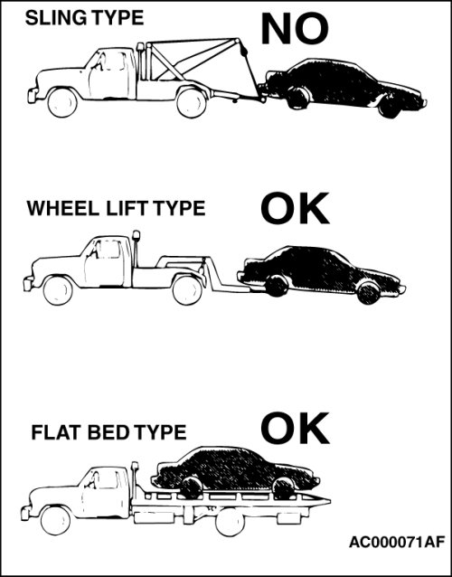 This vehicle cannot be towed by a wrecker using sling-type equipment; otherwise the bumper may become deformed. If this vehicle is towed, use wheel lift or flat bed equipment.