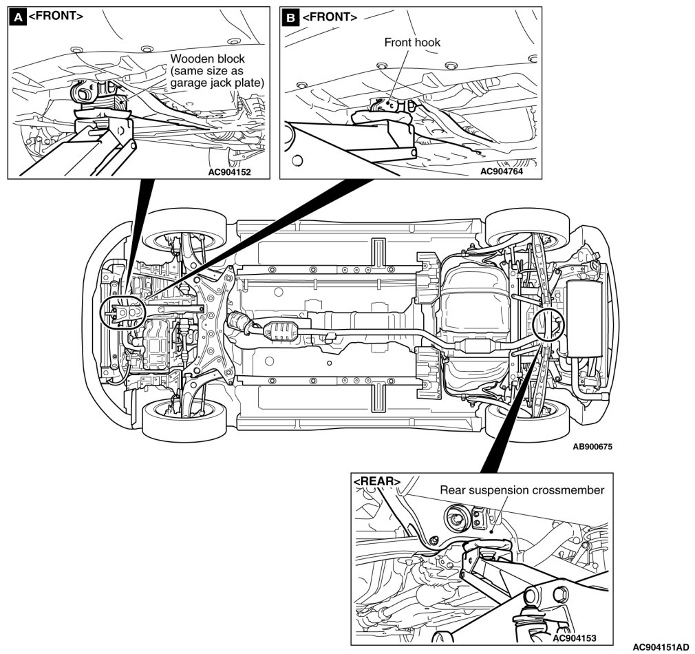 - When supporting the center member supporting points with the garage jack, raise the vehicle with inserting a wooden block (same size as garage jack plate) between the center member and the garage jack to prevent the towing hook interference. (Refer to figure A below)