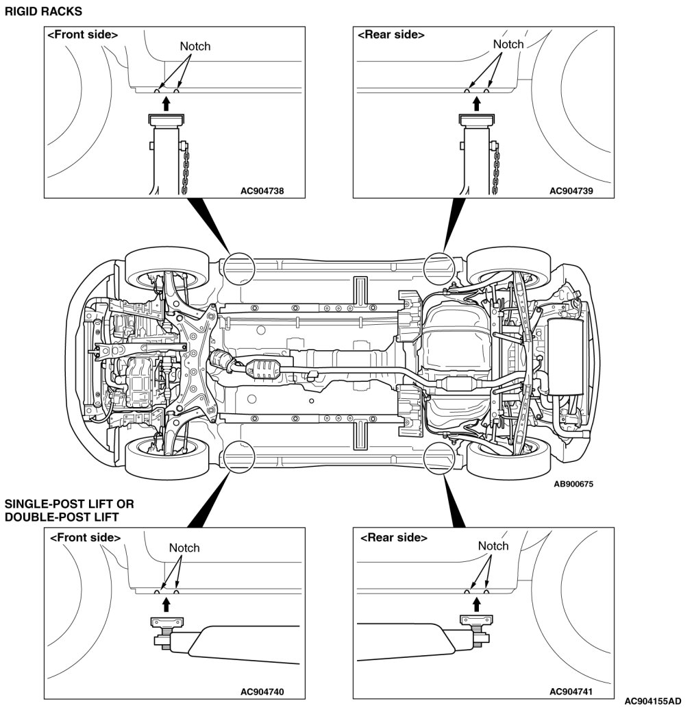 - Be sure to support the specified locations only. Otherwise, deformation of vehicle may occur.