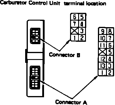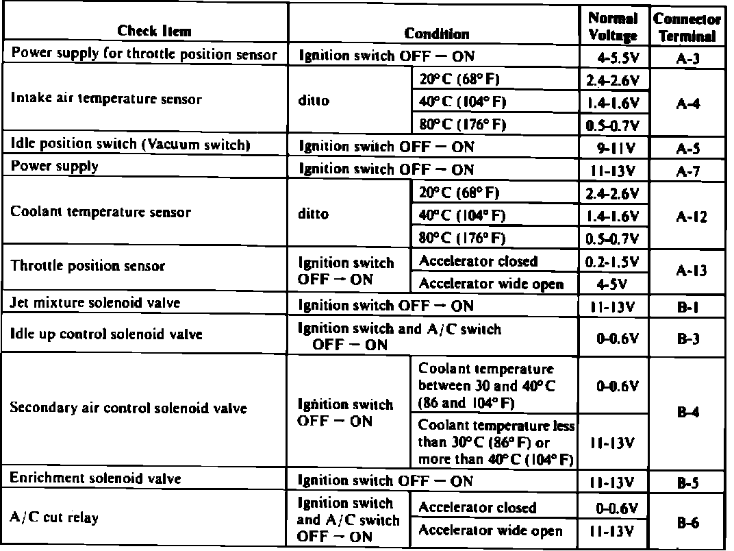 3. Refer to the 1984 FBC System Voltmeter Check Chart I (see page 3). Note the connector terminal callouts in the right column. Insert the positive probe into each connector terminal in turn. Switch the ignition from OFF to ON, and compare the voltage with that shown in the chart. For example, when the probe is on terminal A13, the voltmeter should read between 0.2 and 1.5V as shown in Figure 2 with the accelerator closed, and 4-5V when the accelerator is open.