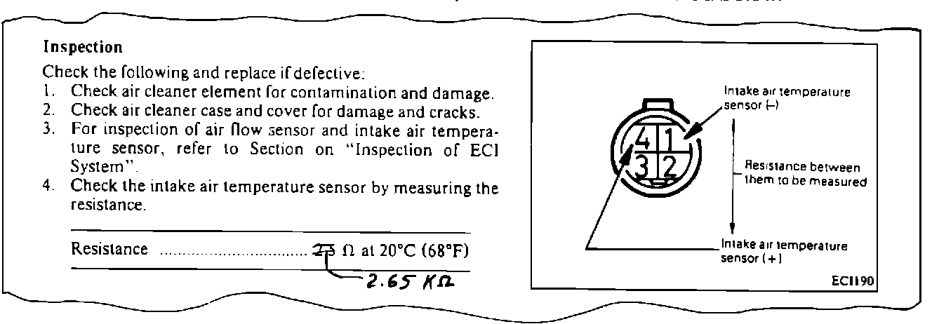 1985 STARION SERVICE MANUALS, PAGE 14-33 AND 1986 STARION SERVICE MANUAL, PAGE 14-38. Change the resistance value for the intake air temperature sensor as illustrated below.