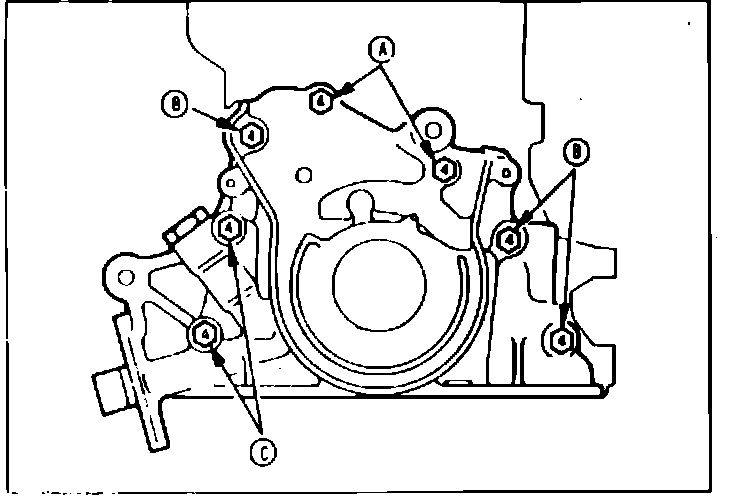 3. Reverse procedure to install. When installing timing case attaching bolts, refer to Fig. 31 and note that bolts to be installed in location A are 1.18 inch in length, bolts installed in location B are .79 inches in length and bolts installed in location C are 2.36 inches in length. When installing oil seal, lubricate seal lips with engine oil, then position seal on crankshaft and tap into timing case using tool No. MD998306. Before installing oil pan, apply sealer at the four front timing case and rear oil seal case to cylinder block mating surfaces. Torque front timing case attaching bolts to 9-10 ft. lbs. and oil pan attaching bolts to 4.5-5.5 ft. lbs.