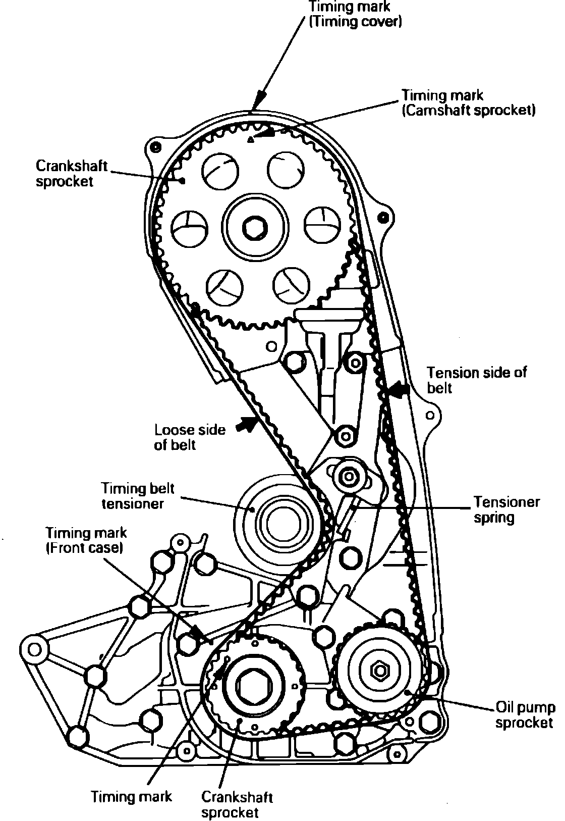 Fig. 35 Timing belt, tensioner and sprockets. 1600cc engine: