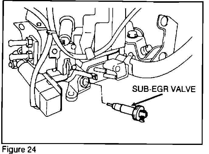 5. Dry the valve and plunger hole thoroughly. If removed, install the spring, steel ball, pin and snap ring. Reinstall the Sub-EGR valve in the carburetor (Figure 24). Connect the valve linkage to the pin.