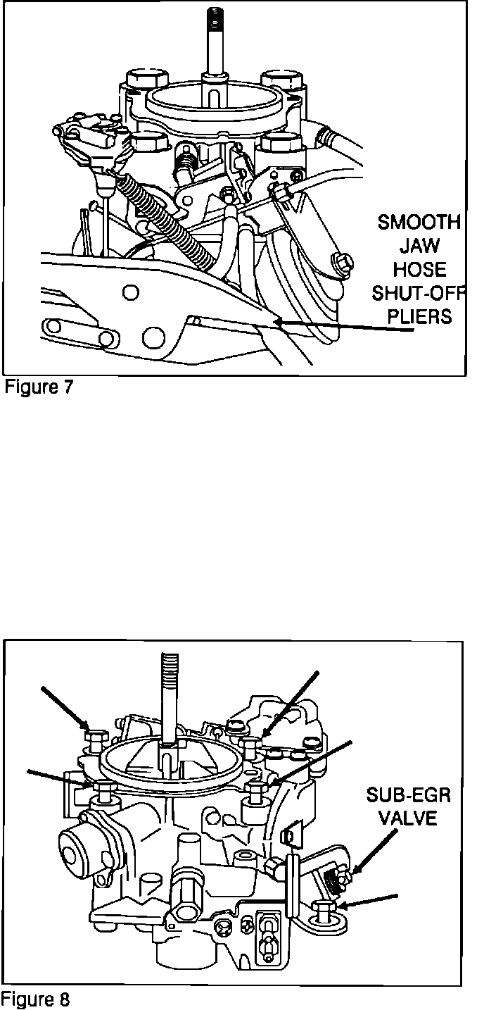5. Remove the four carburetor through bolts, washers, and the bolt and lock washer at the left rear corner of the carburetor near the Sub-EGR Valve.