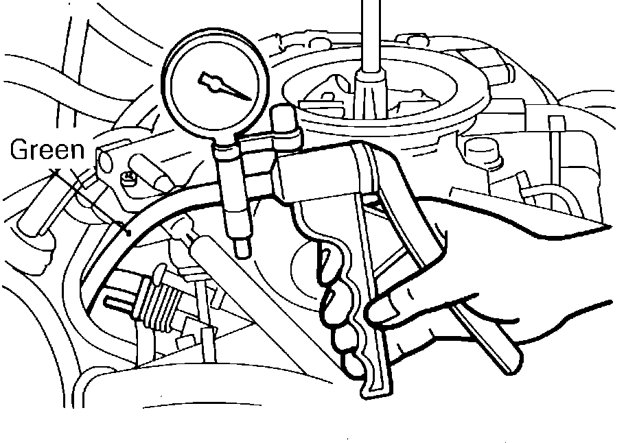 1. Disconnect the vacuum hose (green stripe) from the carburetor throttle body and connect a hand vacuum pump to the vacuum hose, Fig. 129.