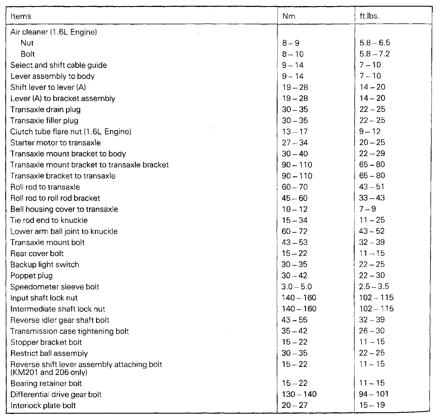 KM200/201/206 M/T, Transaxle Torque: