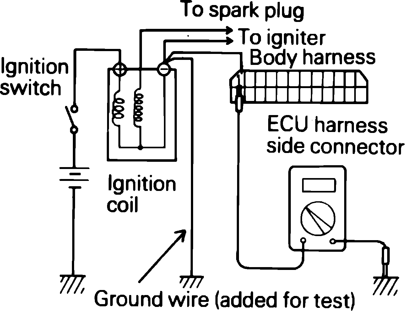 Check that continuity exists between ignition coil negative terminal and ECU terminal 1,