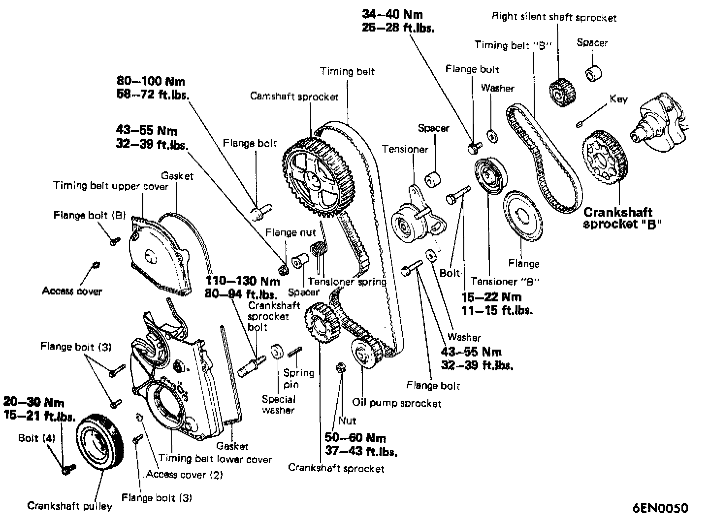 Lift tensioner "B" with finger tip to tighten timing belt "B" so that its tension side will be taut. In this condition, tighten bolt to secure tensioner "B". When bolt is tightened, use care to prevent shaft from turning together. If shaft is turned together, belt will be overtensioned. Tighten the right silent shaft retaining flange bolt to 34-40 Nm (25-28 ft.lbs.).