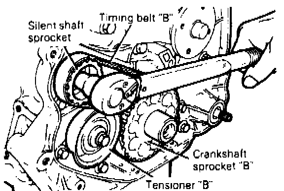 - After timing belt "B" has been removed, do not attempt loosening bolt, while holding sprocket with pliers, etc.