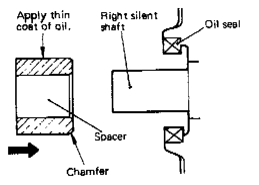 2. Lightly apply engine oil to the outer surface of spacer, and then install spacer to the right silent shaft. Be sure to install in the direction shown in the illustration.
