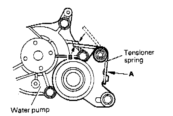 11. Install end "B" of spring to predetermined position of water pump.