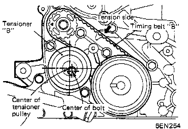 4. Install timing belt "B" and adjust the belt tension. See Timing Belt Installation Procedure" for detailed procedure.