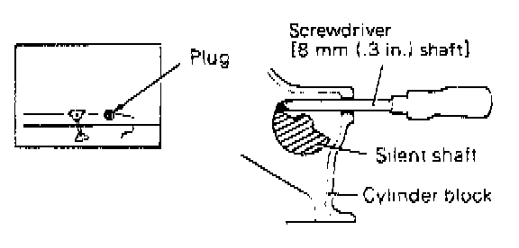 9. Remove plug at left side of cylinder block and insert a screwdriver to keep left silent shaft in position. Screw- driver used for this purpose should have a shaft 8 mm (0.3 in.) in diameter which can be inserted more than 60 mm (2.36 in.).