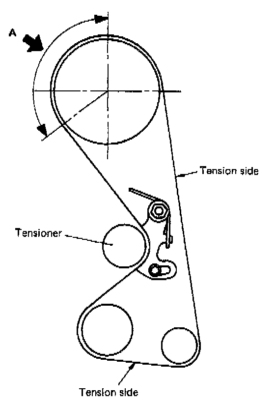 12. Install timing belt. While making sure that tension side of belt is not slackened, install timing belt onto crankshaft sprocket, oil pump sprocket and camshaft sprocket in that order.