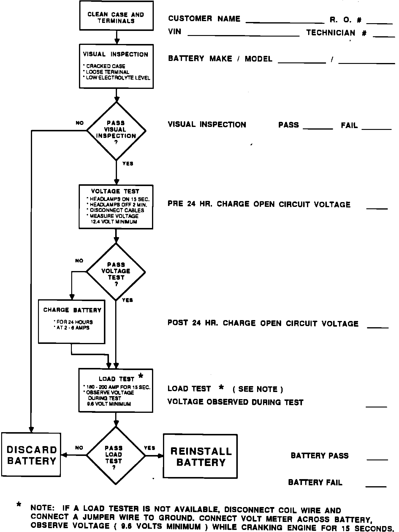 NOTE: If a load tester is not available, disconnect the coil wire and ground it with a jumper. Connect a voltmeter across the battery and observe voltage (9.6V minimum) while cranking the engine for 15 seconds.