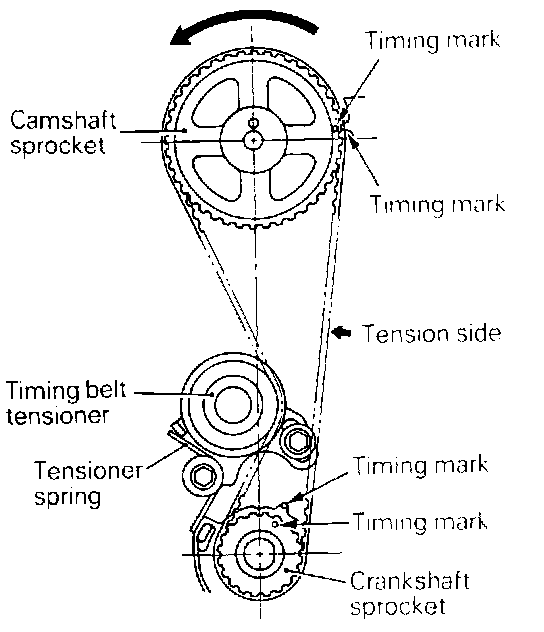 (3) Apply counter-clockwise force to the camshaft sprocket to give a tension to the belt on tension side and make sure that all timing marks are lined up.