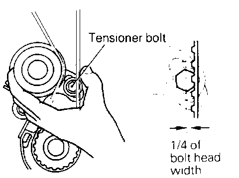 (10) Hold the tensioner and timing belt by hand and give the belt a slight thumb pressure at a point level with the tensioner center. Make sure that the belt cog crest comes as deep as about 1/4 of the width of slot side bolt head.