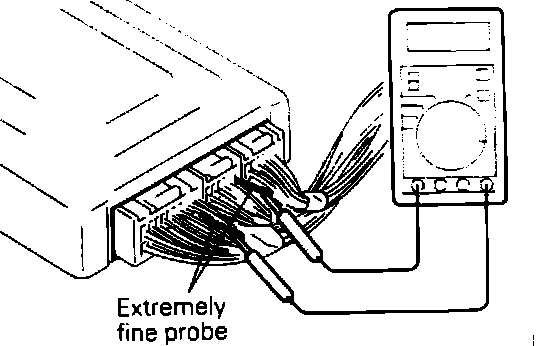 To test pins using a multi-meter do not remove the connector from the ECU, instead insert a straight pin or needle from the back side of the connector to access each pin.