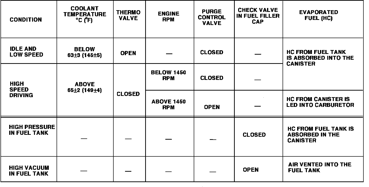 The thermo valve is used to prevent purge system operation until the engine has warmed up (coolant temperature greater than 45 degrees C or 113 degrees F). This prevents driveability problems and excessive hydrocarbon emissions during engine warm up.