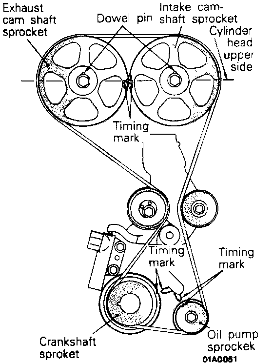 (1) Turn the crankshaft clockwise and align the timing marks so as to bring the No.1 cylinder to compression top-dead-center position. At this time the timing marks of the camshaft sprocket and the upper surface of the cylinder head should coincide, and the dowel pin of the camshaft sprocket should be at the upper side.