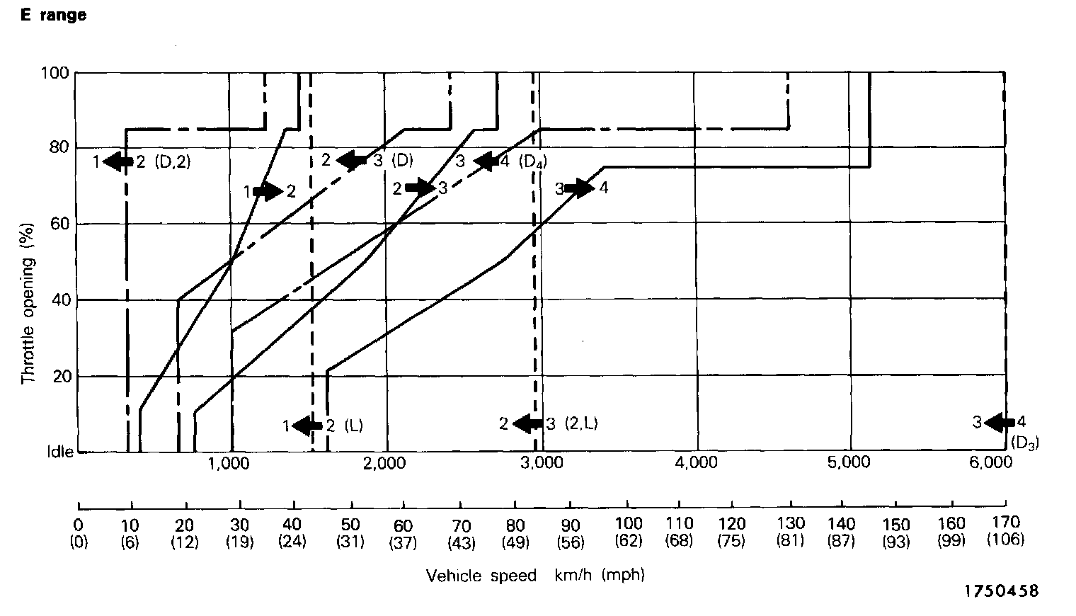 The solid lines shown in these shift patterns indicate up-shifts, and the broken lines indicated downshifts. The reason why there is a difference between the shift points for up-shifts and for downshifts is so that up-shifts and down-shifts will not occur frequently when driving at a speed in the vicinity of the shift point.