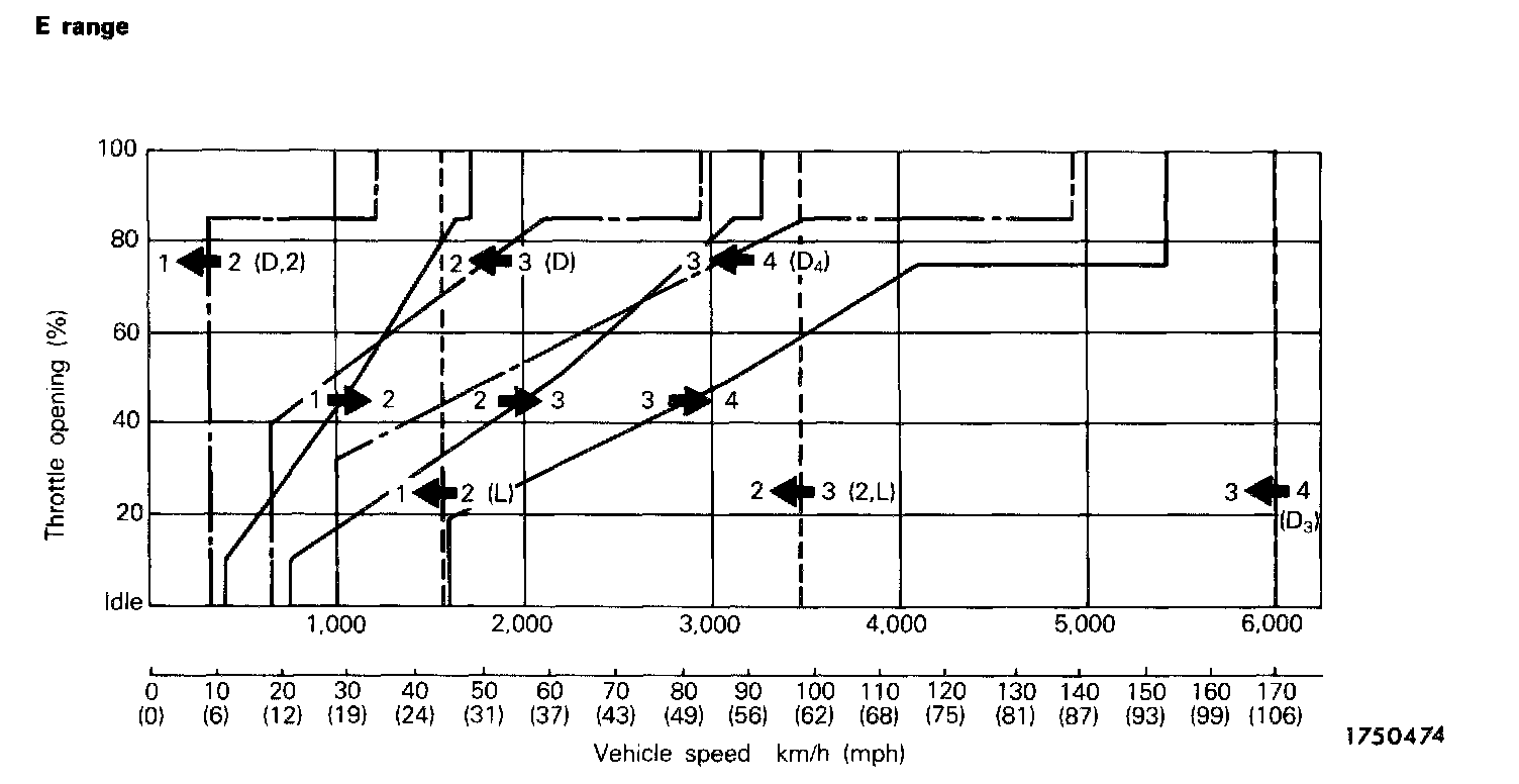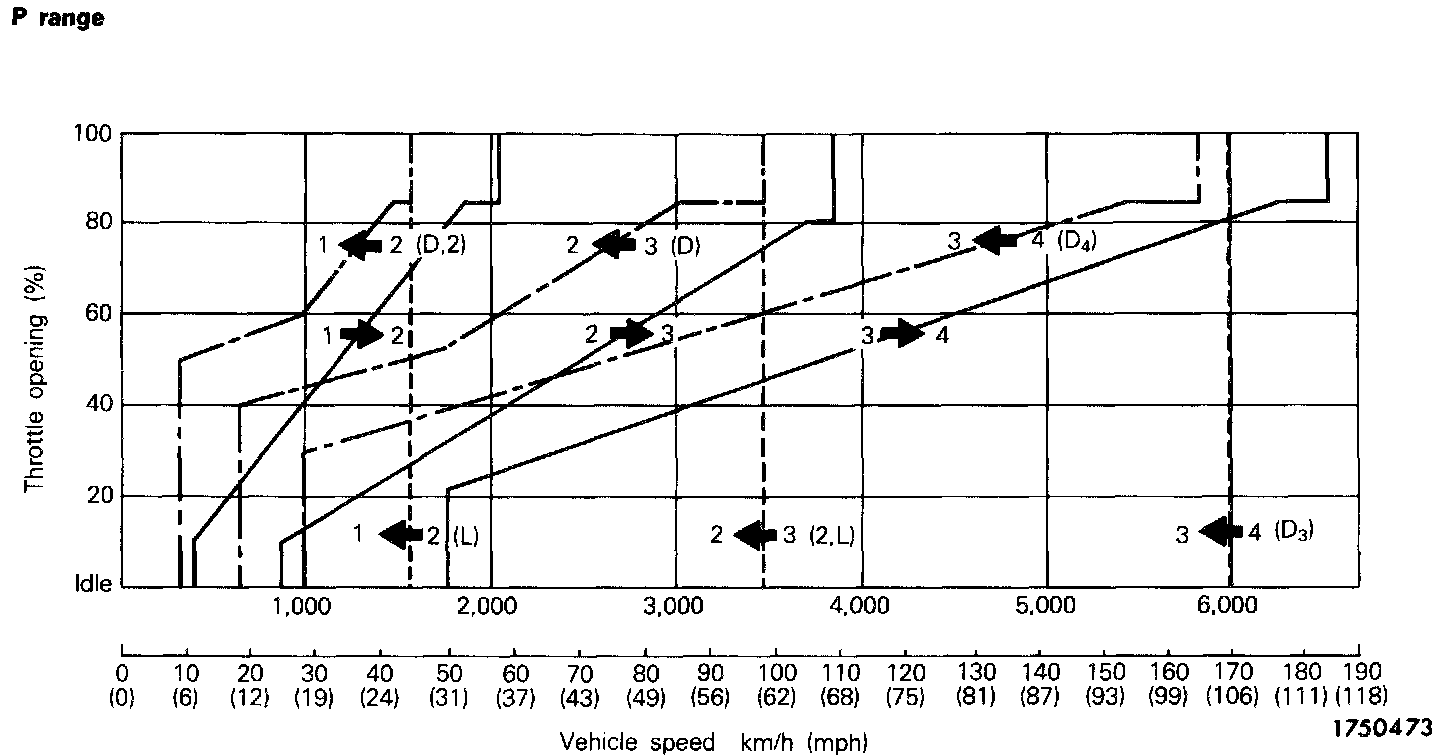 SHIFT PATTERNSTwo shift patterns are pre-stored in the control unit of this transaxle. One is the power pattern (for more powerful performance), and the other is the economy pattern (for improved fuel consumption and quieter operation).